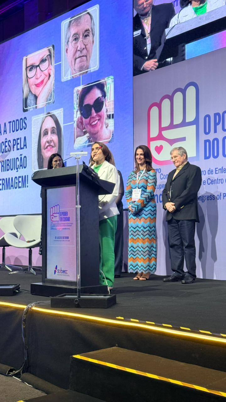 Durante a cerimônia de abertura, Iolanda Beserra foi reconhecida por sua contribuição científica, trajetória acadêmica e compromisso com a formação de novas gerações de profissionais de enfermagem.